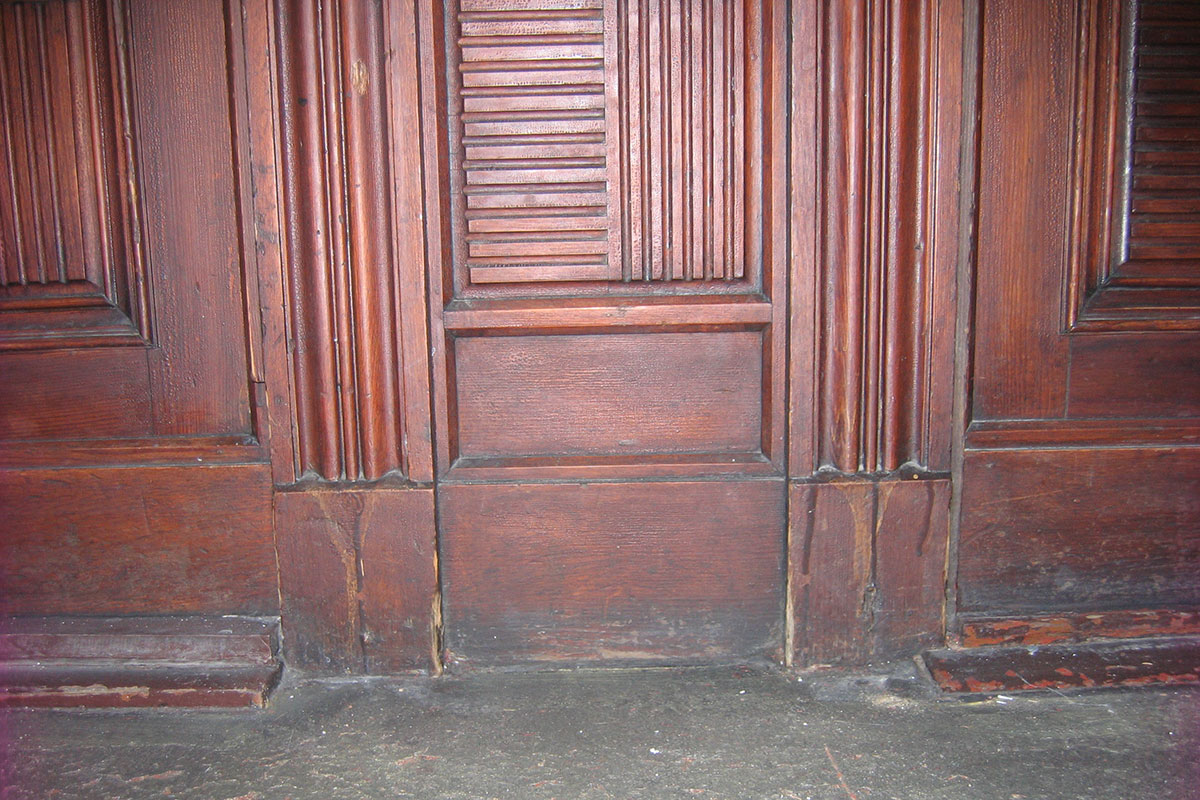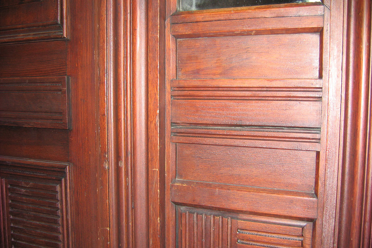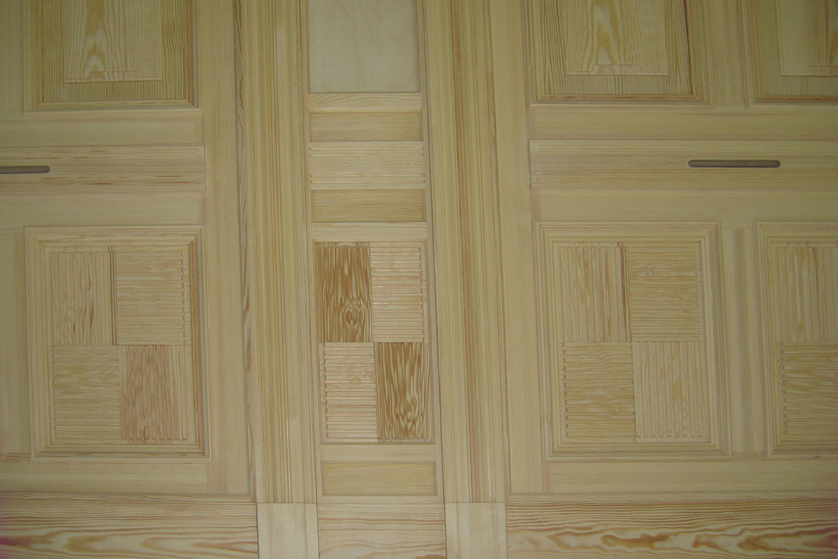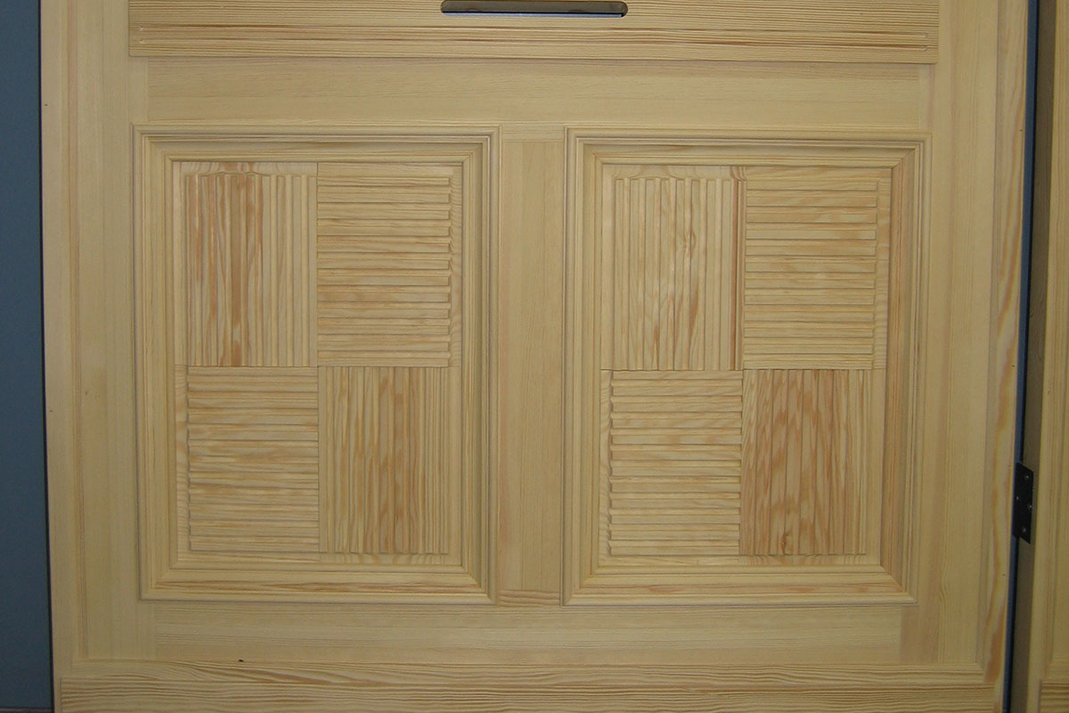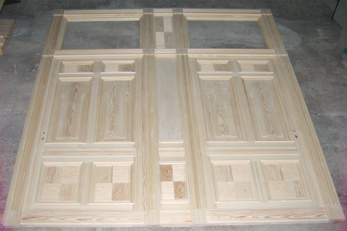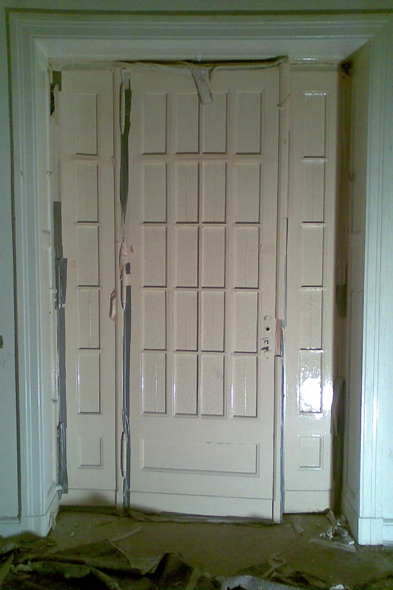 Aufmaß der alten Tür bzw. einer baugleichen Tür im Haus mit allen Füllungen und Verzierungen, Nachbau dieser Tür, damit diese den Brandschaden ersetzen kann. Lieferung unbehandelt oder lackiert möglich.